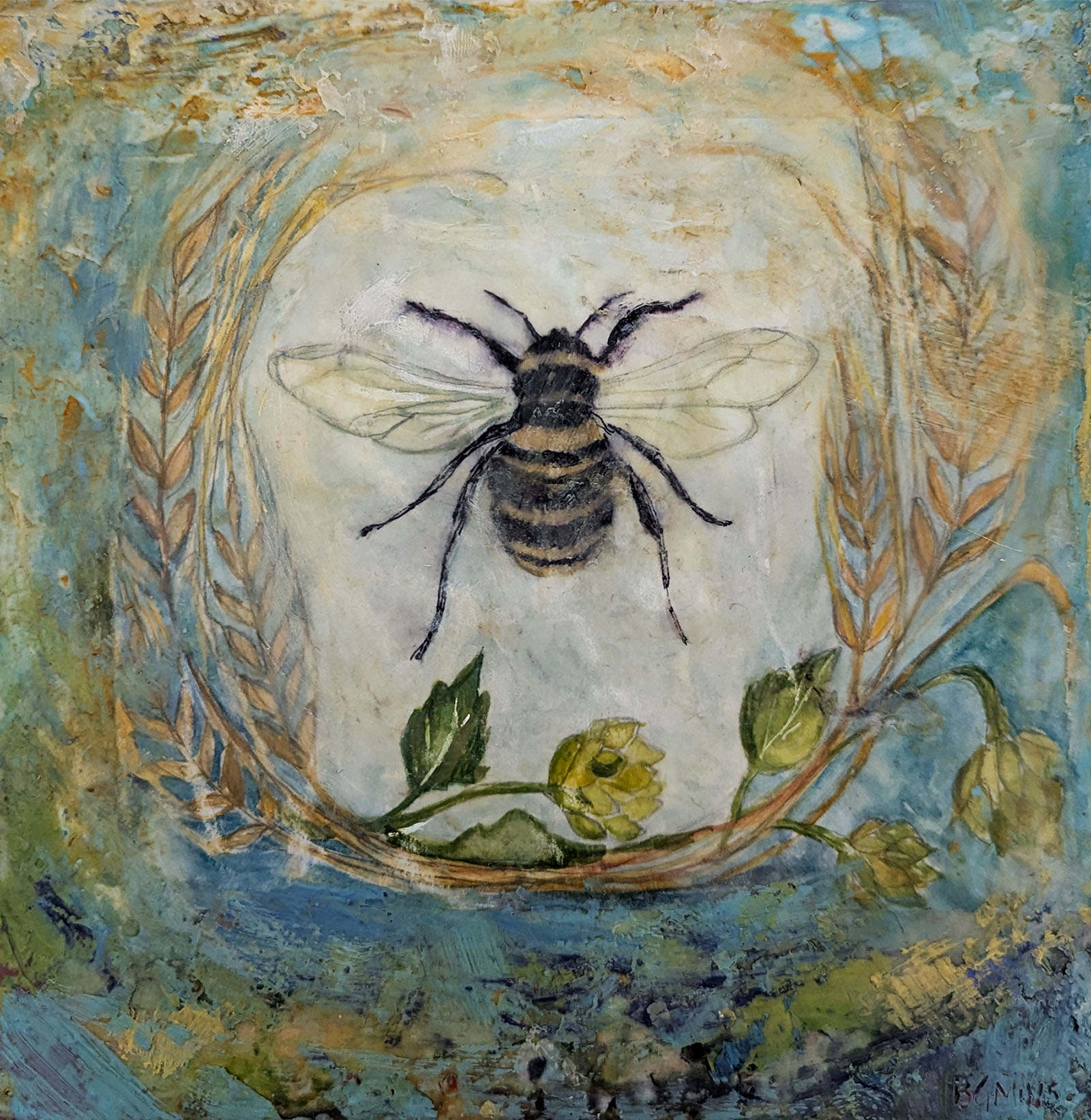 Several years ago I wanted to create a book about bugs and insects, a naturalist/art/folklore type of book. I bound up a beautiful book, but then I only ended up makig three pages! This was one of them. I ended up taking the book apart because I wanted to use the cover for another art piece. I recently came upon my paintings that I had made for the book and decided that they needed to be on their own. I attached this bee watercolor/gouache painting to a wood panel and then kept painting and building up the surface with encaustic paint. The title comes from a book I read about bees. It was a spiritual, other worldly kind of book about bees. Very interesting read. It has always stayed with me.