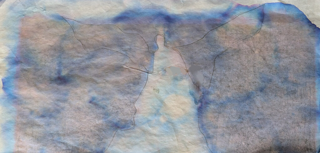 After that dried, what had been a river looked like a female figure, like a spirit. I grabbed a pencil and traced the figure and even put in wings, as it seemed like a spirit. At that point, I decided that when I had sometime in the studio I had to make a painting with this. At first I thought I would do an acrylic mixed media painting, but then decided that it had to be encaustic to have that translucent watery feeling that one an create with layers of wax.