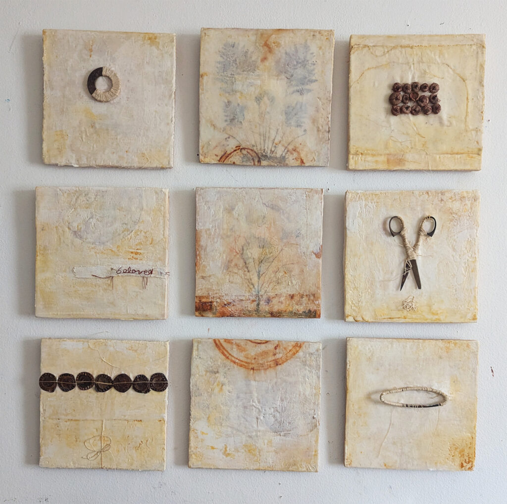 Those two panels led to nine. And the title “Walking this Earth”. I feel that walking this earth is a holy thing. For all of us. Taking these mundane discarded elements and putting them on a panel as a tribute to the things that are discarded or overlooked. Prayers of gratitude for things simple, ordinary and earthy.
