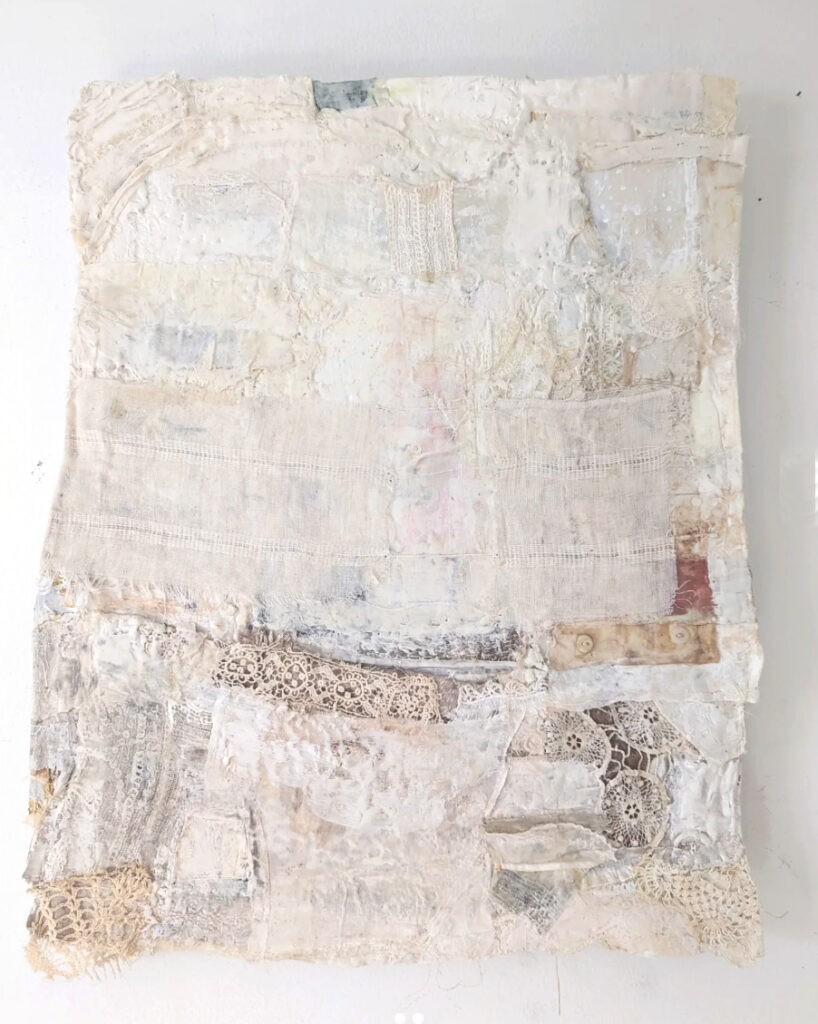 I have a second piece in this exhibit, I’ve Been Birthed May Times Over, that is made of salvaged textiles. One of the fabrics in it came from a baptismal gown.