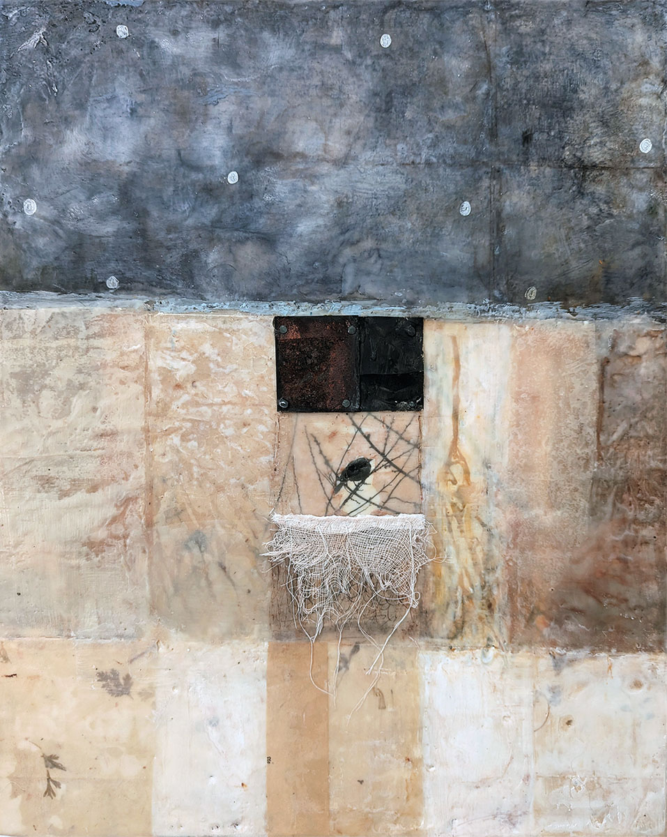There’s a lot if different media in this piece- encaustic, pigment sticks, photocopy transfer, stained teabag paper, rice paper, paper from old salvaged books, and handmade paper with embedded dried plants, and cheesecloth. Oh and posca marker. This is why in my descriptions I just use “mixed media” instead of listing every single thing. My labels would be really long then. I wonder though if I should list it out. Maybe just for my records.